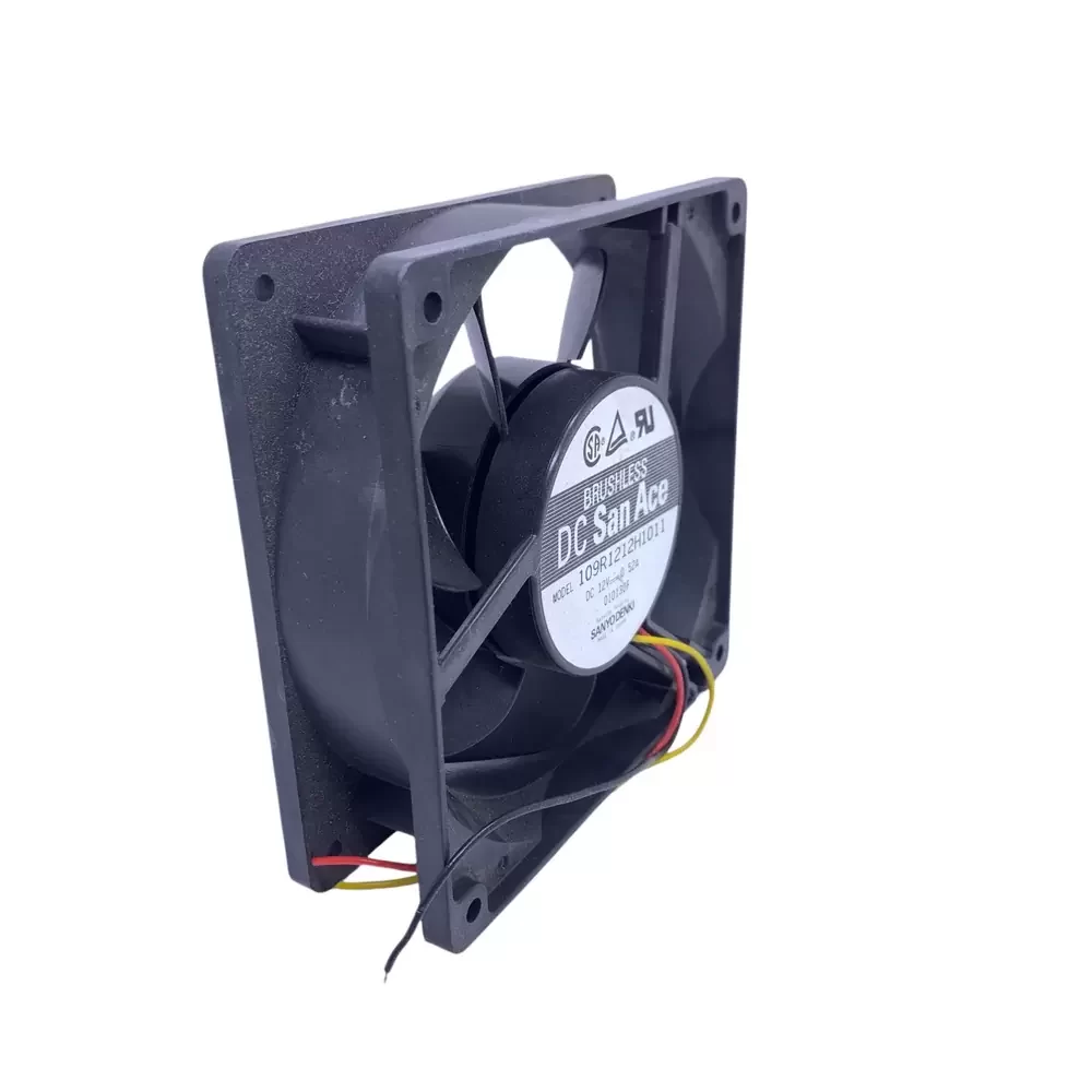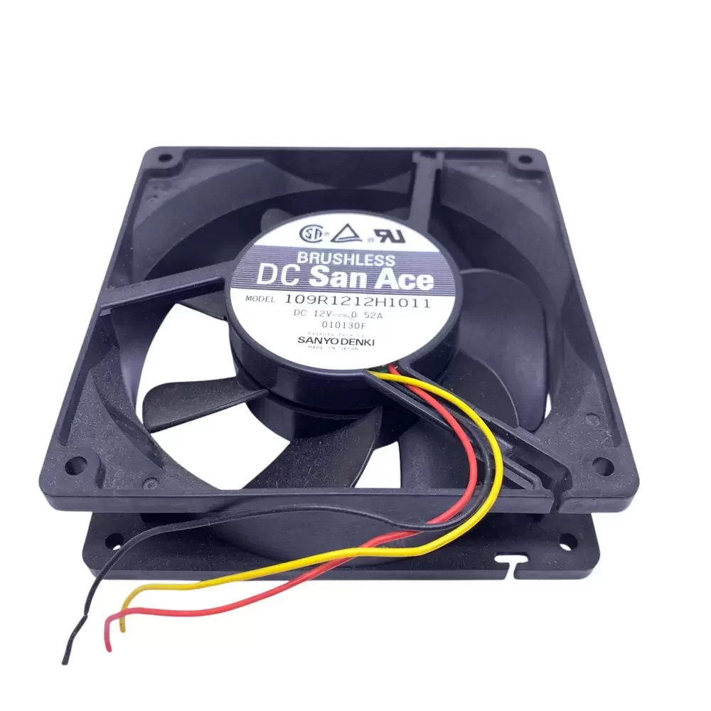 Sanyo Denki 109R1212H1011 is a 120 x 120 x 38 mm axial fan operating at a nominal 12 VDC with a rated current of 0.52 A. This high-performance cooling unit features a dual ball bearing system and a plastic frame and impeller rated to UL 94V-0 flammability standards. It delivers a maximum airflow of 2.9 m³/min (102.4 CFM) and a maximum static pressure of 64.7 Pa at a rated speed of 2800 RPM. The internal motor architecture includes polarity protection and locked rotor burnout protection, ensuring operational stability across a temperature range of -20 to +70 °C.