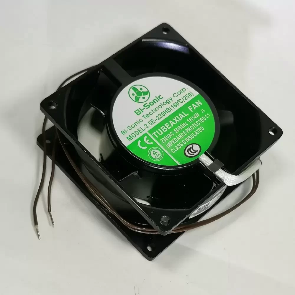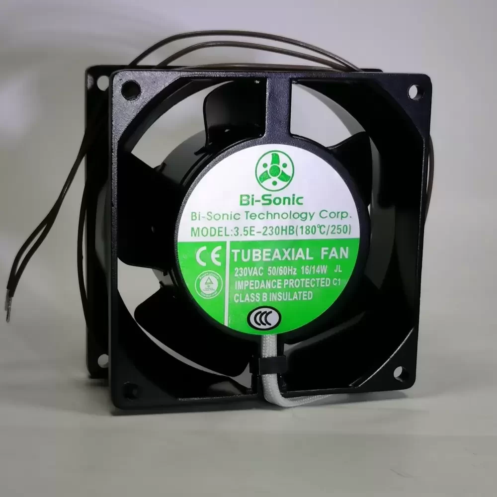 The Bi-Sonic 3.5E-230HB(180°C/250) is a specialized AC Axial Fan designed explicitly for extreme thermal environments where standard cooling solutions fail. Engineered with a robust all-metal chassis and impeller, this unit ensures superior structural rigidity and resistance to thermal deformation up to 180°C. The motor utilizes high-grade, high-temperature ball bearings to maintain operational stability under severe thermal stress, optimizing thermal impedance management within industrial enclosures. Its aerodynamic metal blade design balances airflow efficiency with durability, making it an essential component for critical heat dissipation applications requiring reliable performance in harsh, high-temperature conditions.