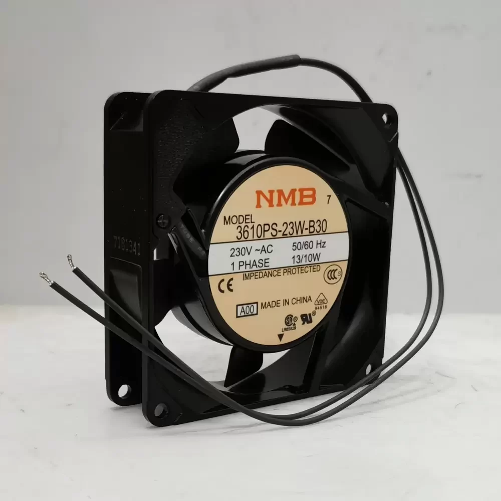 The NMB 3610PS-23W-B30-A00 is a precision-engineered AC Axial Fan designed for robust thermal management in industrial environments. Utilizing a shaded pole induction motor architecture, this unit ensures consistent torque delivery and operational stability under varying load conditions. The construction features a durable aluminum die-cast frame paired with a polycarbonate impeller, optimizing structural rigidity while minimizing rotational mass for improved aerodynamic efficiency. Equipped with high-grade dual ball bearings, the fan offers reduced friction coefficients and extended service life, effectively managing thermal impedance in high-density electronic enclosures. Its design balances airflow throughput with static pressure capabilities, making it suitable for continuous duty cycles.