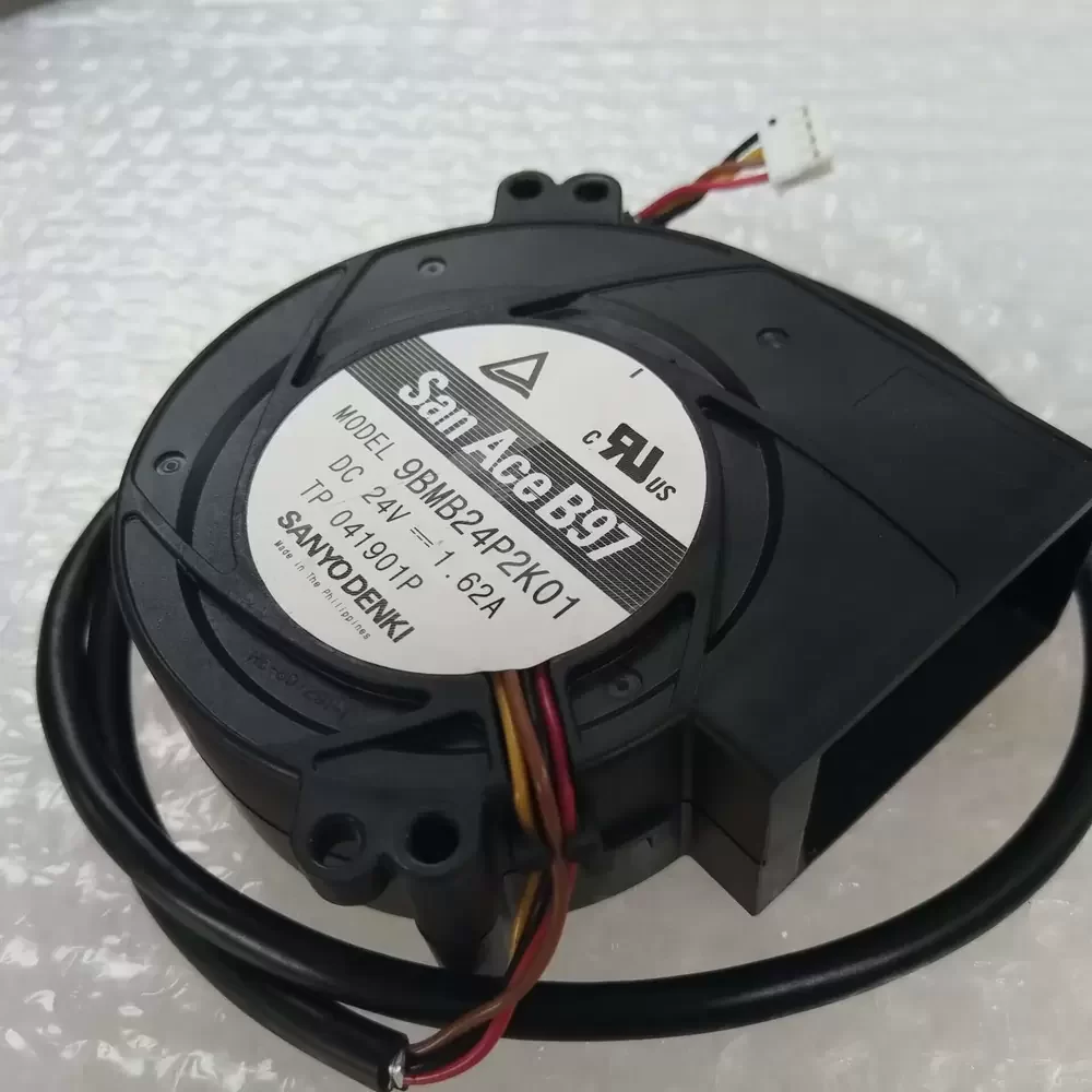 Sanyo Denki 9BMB24P2K01 is a 24VDC 97x97x33mm Centrifugal Blower optimized for high-impedance thermal management in precision optical projection systems. This San Ace B97 series unit features a high-efficiency DC motor with a dual ball bearing architecture designed to minimize mechanical friction and extend service life in high-temperature environments. The aerodynamic impeller is engineered for maximum structural rigidity, allowing it to maintain stable airflow against significant backpressure. Operating at a rated current of 1.62A and a peak speed of 6500 RPM, this blower delivers a robust 580 Pa of static pressure, making it an essential component for maintaining the thermal equilibrium of high-lumen projector light engines and internal circuitry.