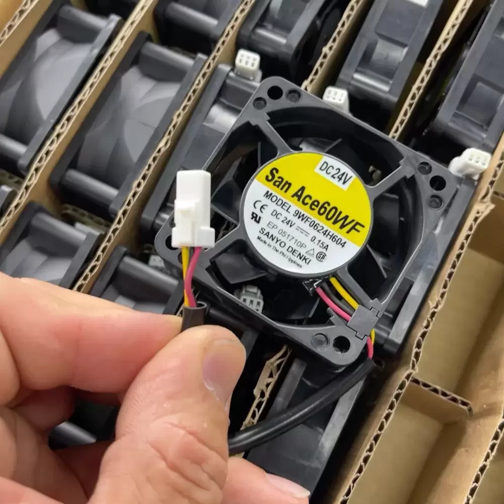 Sanyo Denki 9WF0624H4D04 is a 60 x 60 x 25 mm axial cooling fan operating at a nominal 24 VDC with a 0.15 A current draw. This oil-proof component features a die-cast aluminum frame and a dual ball bearing assembly designed for continuous operation in environments with oil mist. The unit generates a rotational speed of 6500 RPM, producing a maximum airflow of 0.7 m³/min and a static pressure of 100 Pa. It incorporates a 3-wire electrical interface with a dedicated pulse sensor for real-time tachometer output.