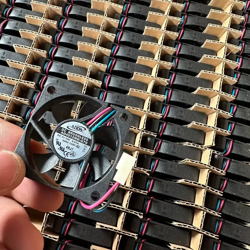 ADDA AD4512MB-G76 is a 45 x 45 x 10 mm axial cooling fan operating at 12 VDC with a nominal current of 0.07 A and a power consumption of 0.84 W. The unit features a dual ball bearing system and a frame and impeller constructed from UL 94V-0 rated thermoplastic PBT. It delivers a maximum airflow of 7.5 CFM and a static pressure of 0.120 In H2O at a rotational speed of 5000 RPM. The electrical interface consists of three 26 AWG lead wires, and the internal motor includes impedance protection and polarity protection mechanisms.