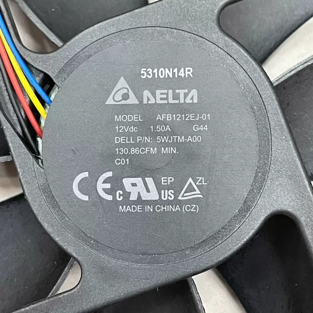 Delta AFB1212EJ-01G44 is a 120 x 120 x 25 mm axial cooling fan operating at a nominal 12 VDC with a rated current of 1.50 A and a maximum airflow capacity of 130.86 CFM. The unit features a dual ball bearing system and a brushless DC motor housed within a UL 94V-0 plastic impeller and frame. It utilizes a 4-wire interface supporting pulse width modulation (PWM) for precise speed control, achieving a static pressure of 18.38 mmH2O at a rotational speed of 4500 RPM. The internal construction includes a locked rotor protection mechanism and polarity protection to ensure operational stability under high-performance thermal loads.