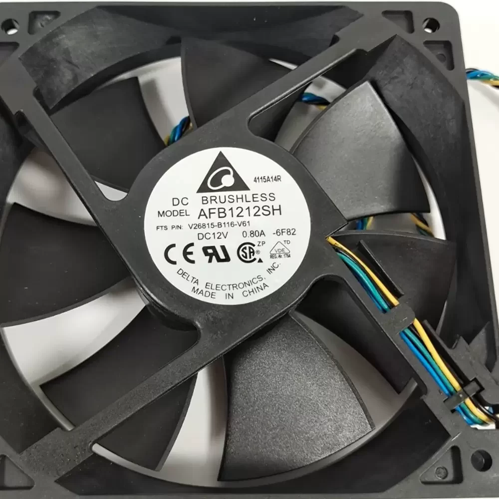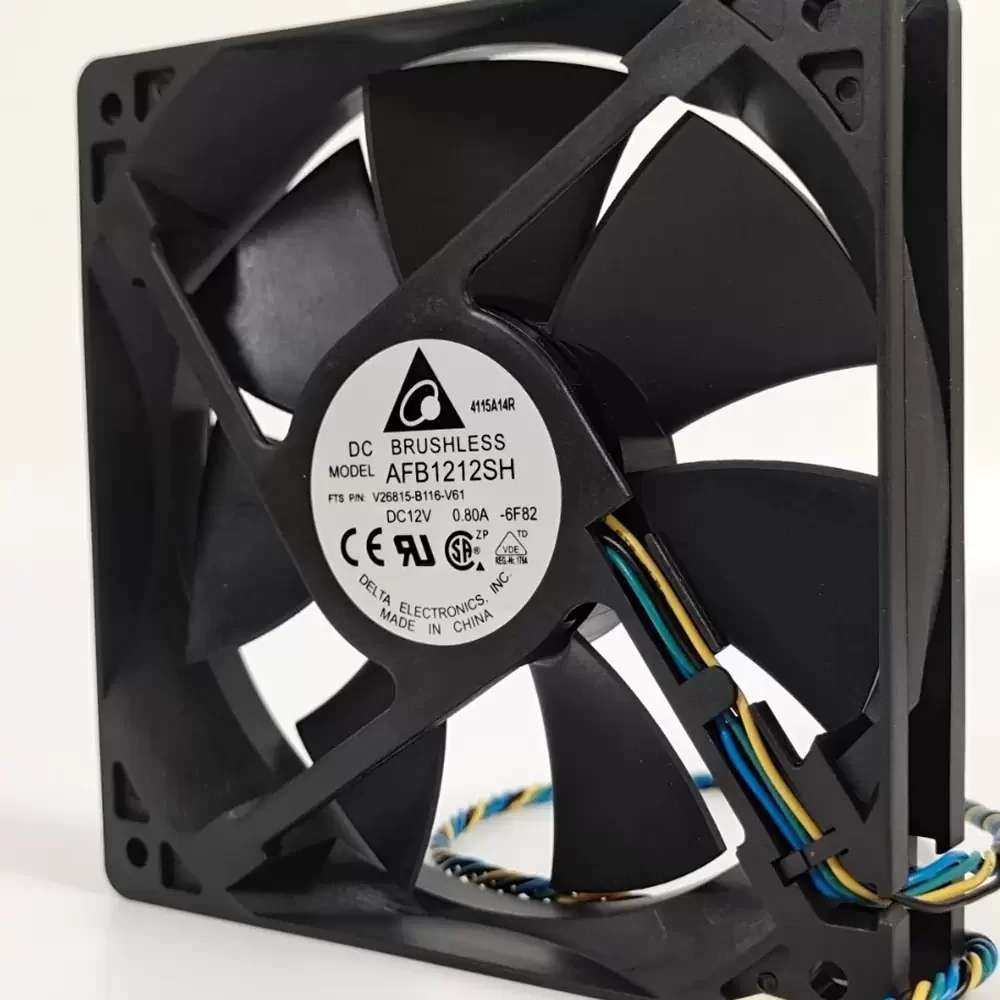 Delta AFB1212SH-6F82 is a 12VDC 120x120x25mm Axial Fan optimized for high-density thermal management in space-constrained enclosures. This unit features a sophisticated dual ball bearing architecture designed to minimize thermal impedance and ensure long-term structural rigidity under continuous operation. The aerodynamic impeller design is engineered for high static pressure, delivering a robust 113 CFM of airflow at a rated speed of 3400 RPM. Utilizing a 0.80A current draw, the motor integrates PWM speed control for precise thermal regulation, making it an ideal replacement fan for high-performance computing environments requiring efficient heat dissipation and low mechanical vibration.