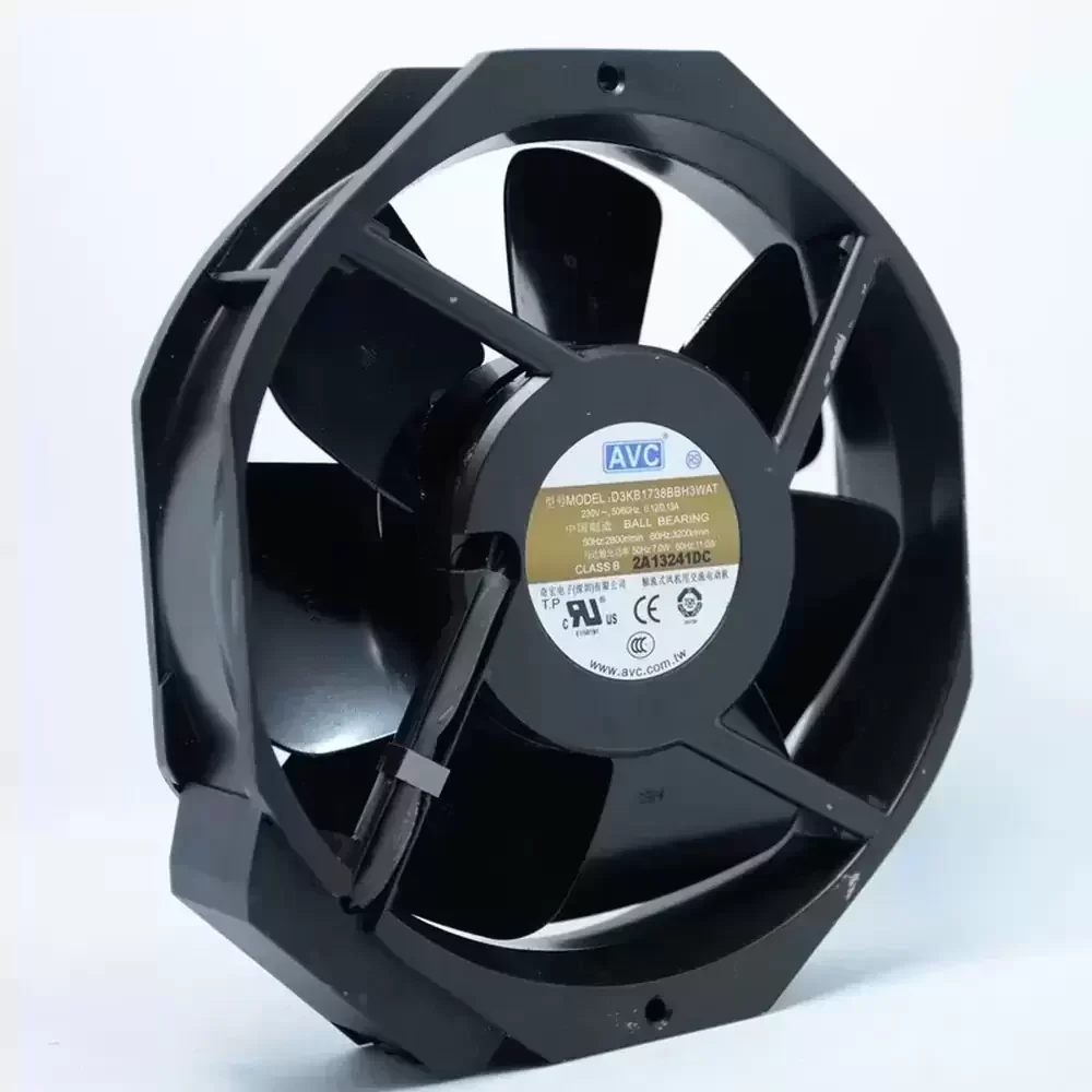 The AVC D3KB1738BBH3WAT is a robust AC axial fan engineered for demanding industrial environments requiring high thermal dissipation and structural integrity. This unit operates on a 230VAC supply and features a durable metal impeller designed to withstand elevated operating temperatures and maintain structural rigidity under high-speed rotation. Utilizing a precision dual ball bearing system, the motor delivers consistent performance at speeds up to 3200 RPM, ensuring optimal airflow and static pressure generation. The aerodynamic profile of the metal blades reduces turbulence while maximizing air throughput, making it an ideal solution for systems where thermal impedance must be minimized efficiently. Its rugged die-cast aluminum frame ensures longevity and reliability in continuous duty cycles.
