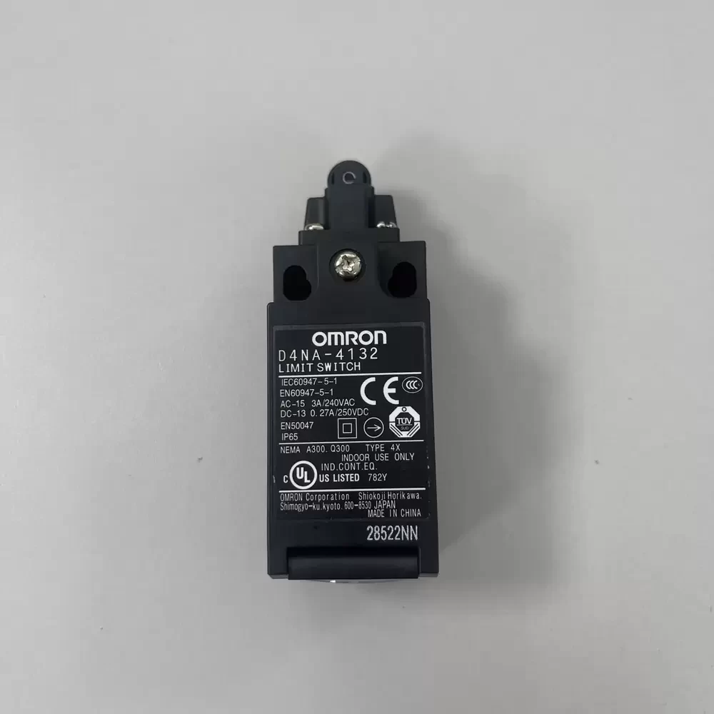 The OMRON D4NA-4132 is a high-precision safety limit switch engineered for industrial automation and elevator safety systems. It features a 1NC/1NO snap-action contact mechanism with a direct opening mechanism to ensure circuit interruption even in the event of contact welding. This model is equipped with a 9.5mm diameter resin roller plunger actuator and a single M20 conduit entry. It operates reliably within a voltage range up to 240VAC and a rated current of 10A, maintaining an IP67 protection rating for harsh environments. The switch is designed for high durability with a mechanical life of 15,000,000 operations and an operating temperature range of -30 to 70°C.