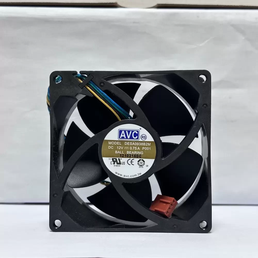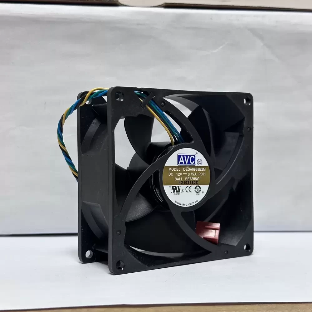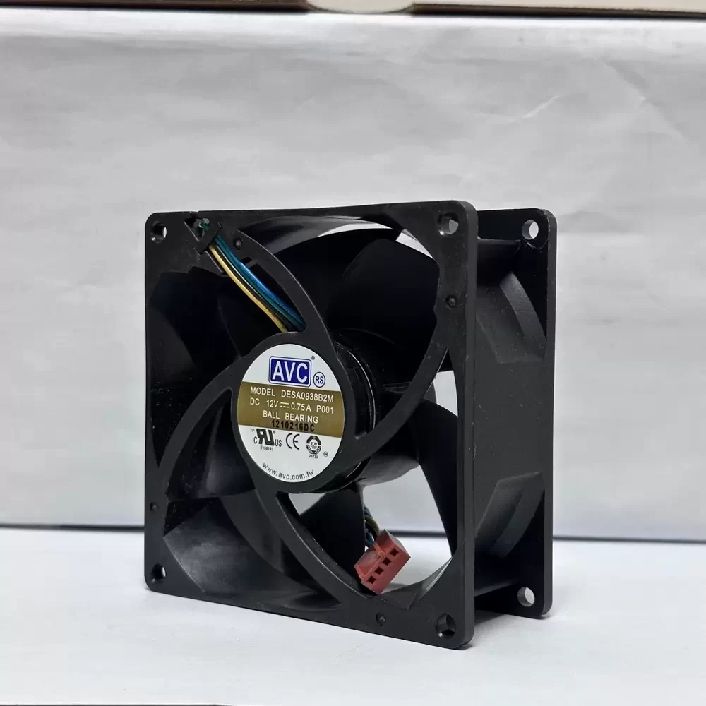 AVC DESA0938B2M-P001 is a 12VDC 90x90x38mm Axial Fan optimized for high-density thermal management in environments with significant system impedance. This unit features a sophisticated brushless DC motor architecture paired with a precision dual ball bearing system to ensure structural rigidity and extended service life under continuous operation. The aerodynamic impeller design is engineered to maximize static pressure, effectively overcoming the resistance of tightly packed electronic components. Operating at a rated current of 0.75A, this fan delivers high-velocity airflow while maintaining precise thermal regulation via its integrated 4-wire PWM speed control interface, allowing for dynamic RPM adjustments based on real-time cooling requirements.
