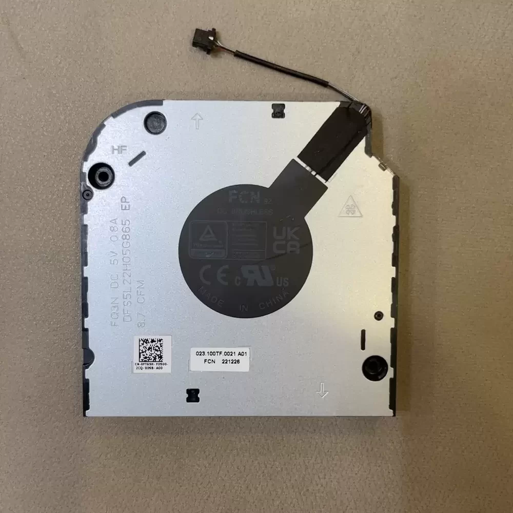 FCN DFS5L22H05G865 is a 5VDC centrifugal blower optimized for high-density thermal management in ultra-mobile computing architectures. Engineered specifically as an OEM replacement fan for Dell Latitude 5540 and Precision 3580 workstations, this unit mitigates severe thermal impedance within constrained chassis environments. Utilizing an advanced DC motor with precision-tuned bearing architecture, it delivers a sustained 8.7 CFM airflow while drawing a highly efficient 0.8A. The aerodynamic impeller design maximizes static pressure to force air through dense copper fin arrays, ensuring structural rigidity and acoustic stability under heavy processing loads. This exact-fit thermal solution guarantees optimal processor performance by preventing thermal throttling in professional-grade laptops.