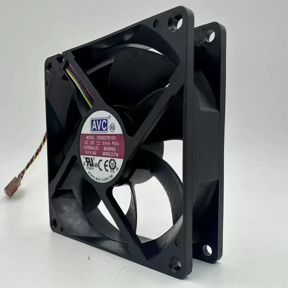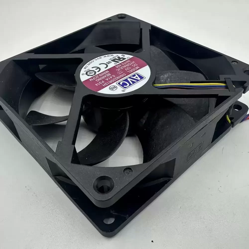 AVC DS09225R12H-P314 92 x 92 x 25 mm 12 VDC 59.2 CFM axial cooling fan. The unit features a hydraulic bearing system designed for a 50000 hour service life and operates with a 4-pin PWM interface for dynamic temperature control. Structural characteristics include a standard square frame with a 16 cm lead wire, delivering a static wind pressure of 0.157 inH2O and operating at speeds between 700 and 3800 RPM.