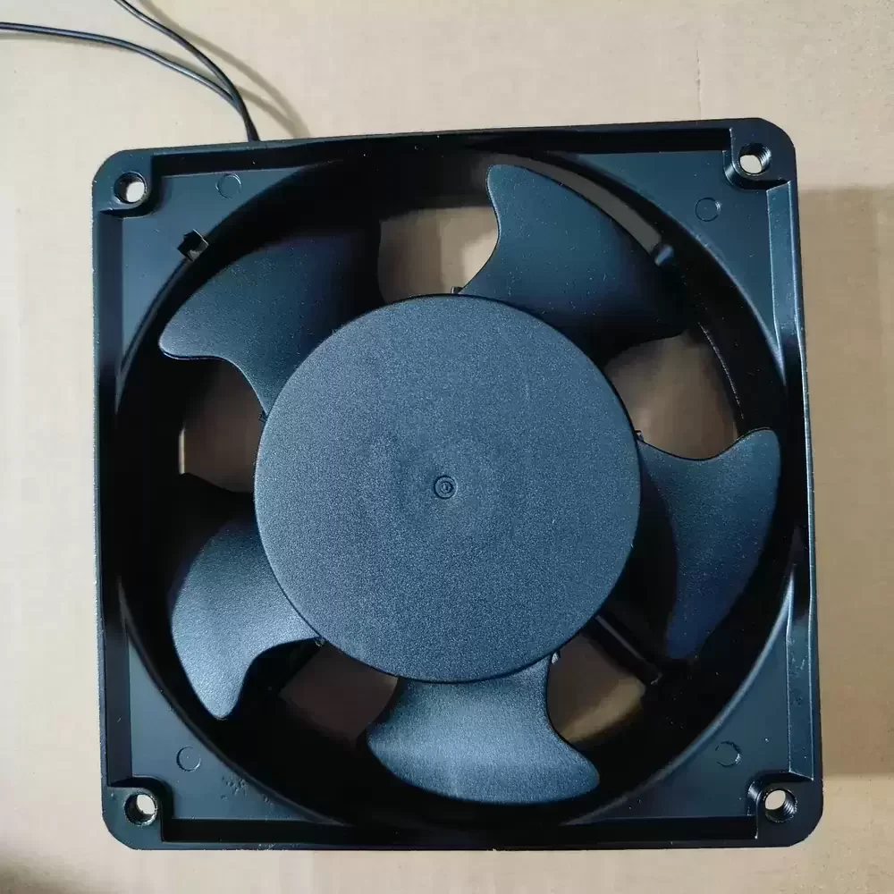 The DGDWXS DS12038HSL is a robust AC axial fan engineered for demanding industrial thermal management applications. Featuring a durable black-painted aluminum alloy frame, this unit ensures structural rigidity and superior heat dissipation properties under continuous operation. The fan utilizes a precision ball bearing system, explicitly designed to withstand elevated operating temperatures up to 120°C, significantly enhancing longevity and reliability compared to standard thermoplastic alternatives. Operating at 220-240VAC, the DS12038HSL delivers consistent airflow performance, making it an optimal solution for high-density electronic enclosures where maintaining thermal equilibrium is critical for component stability.
