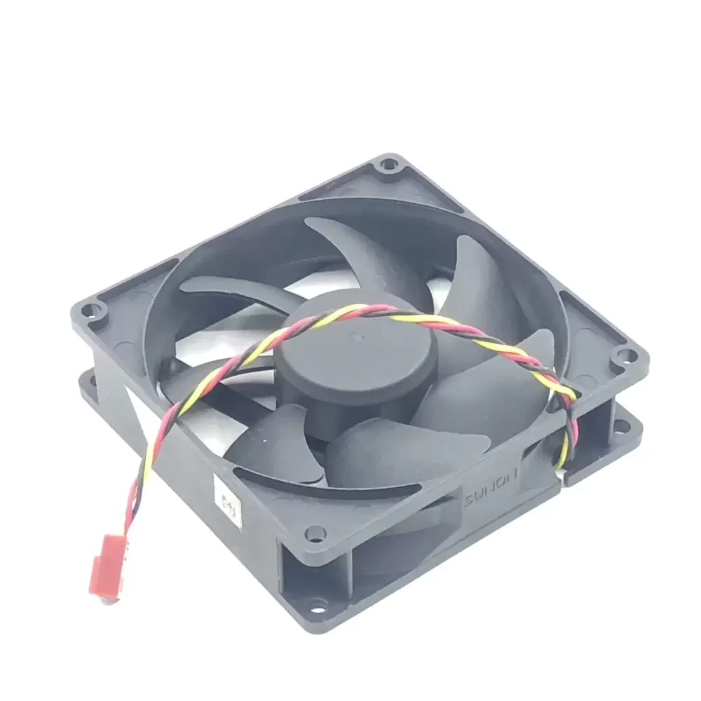 The SUNON EE92251S3-D020-C99 is a precision-engineered DC axial fan measuring 92 x 92 x 25 mm, operating at a nominal 12 VDC with a power consumption of 1.26 W. This hardware component utilizes a hydraulic bearing system to facilitate a rotational speed of 2400 RPM, generating a rated airflow of 37.5 CFM. The unit is constructed with a thermoplastic PBT frame and impeller, meeting UL 94V-0 flammability standards for thermal safety. It features a 3-wire interface with a 3-pin connector, specifically designed for tachometer signal output (F-type) to enable real-time speed monitoring. The internal motor architecture is brushless DC, optimized for low-current draw at 105 mA while maintaining static pressure stability within compact enclosures.