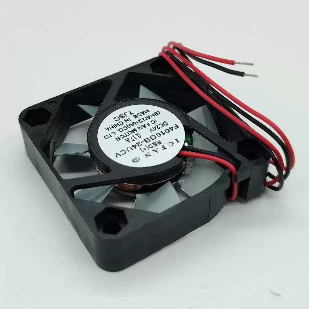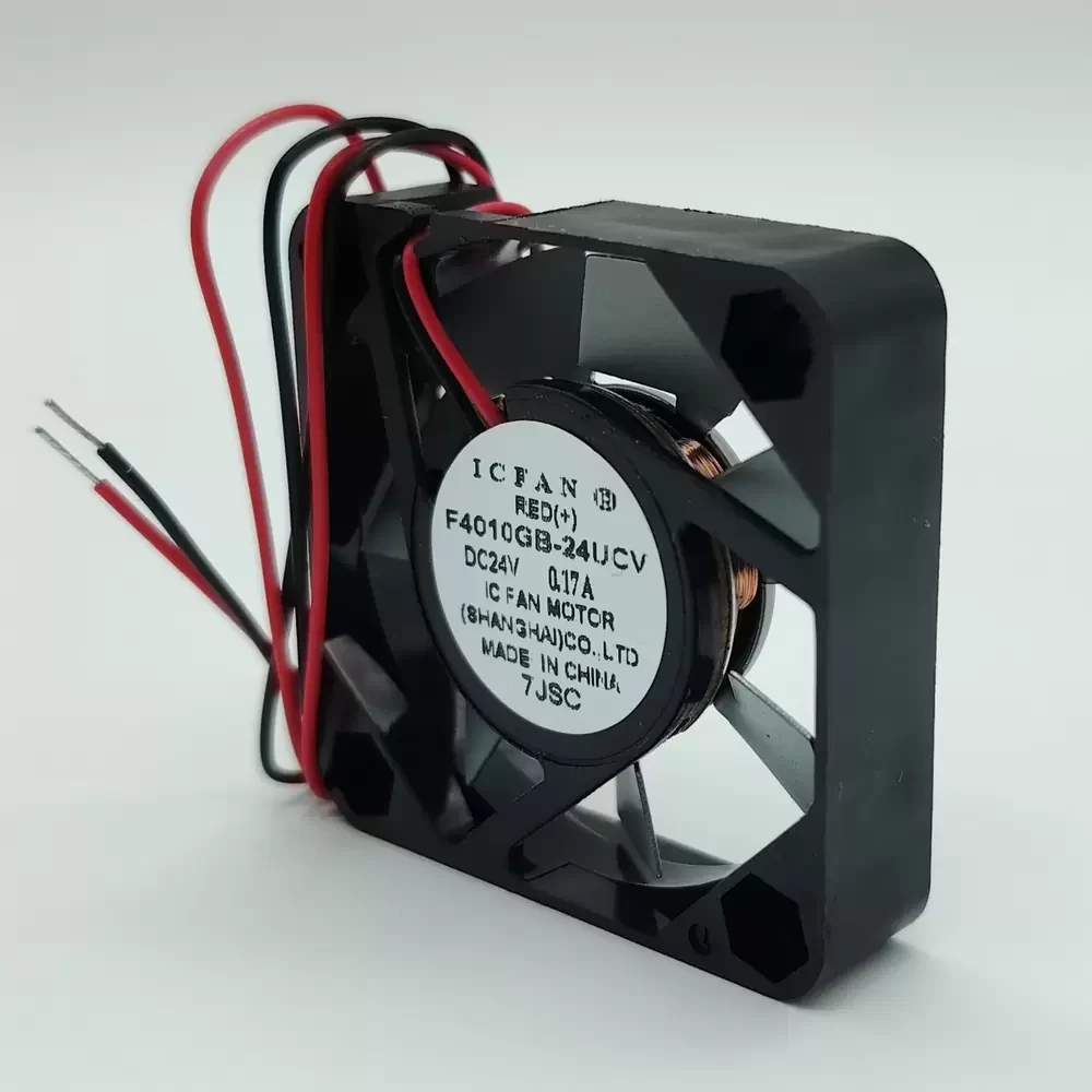 ICFAN F4010GB-24UCV is a 40 x 40 x 10 mm compact axial cooling fan operating at a nominal 24 VDC with a 0.17 A current draw and a 4.08 W power rating. Constructed with a highly durable metal impeller, this unit is engineered to withstand elevated thermal conditions while delivering substantial airflow capacity. The hardware features a standard two-wire interface for direct DC power integration and utilizes a robust dual ball bearing mechanism to ensure extended operational longevity under continuous mechanical stress.