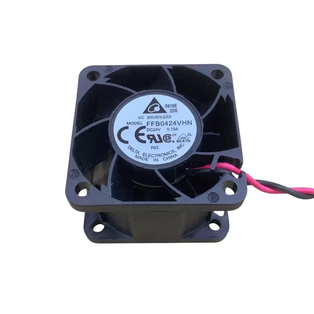 Delta FFB0424VHN is a 24VDC 40x40x28mm Axial Fan optimized for high-density thermal management in space-constrained industrial environments. This unit utilizes a brushless DC motor integrated with a precision dual ball bearing architecture, ensuring low thermal impedance and high structural rigidity under continuous operation. The aerodynamic impeller is engineered to overcome high system resistance, making it ideal for compact enclosures. Operating at a rated current of 0.15A and achieving speeds up to 9500 RPM, this fan provides a robust cooling solution with a focus on long-term reliability. Its UL94V-0 plastic housing ensures safety in critical server and networking applications.