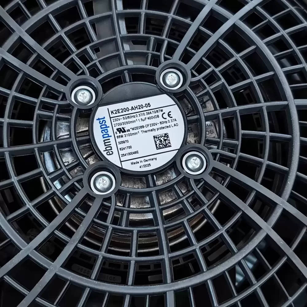 The ebm-papst K2E200-AH20-05 is a 200 mm axial compact fan operating at a nominal 230 VAC and 70 W, delivering a primary airflow capacity of 600 m³/h. The structural architecture incorporates PA plastic blades and a dual ball bearing mechanism, ensuring continuous operation across a temperature range of -30 °C to 55 °C. The unit features a 4-wire interface with a 1.5 µF 400 VDB motor run capacitor and achieves an IP54 ingress protection rating when integrated with its corresponding pleated filter assembly. The mechanical footprint measures 323 mm by 323 mm by 144.5 mm, utilizing a diagonal fan technology engineered for high static pressure stability.
