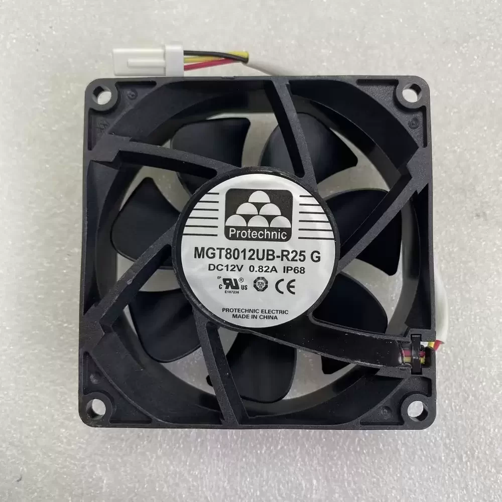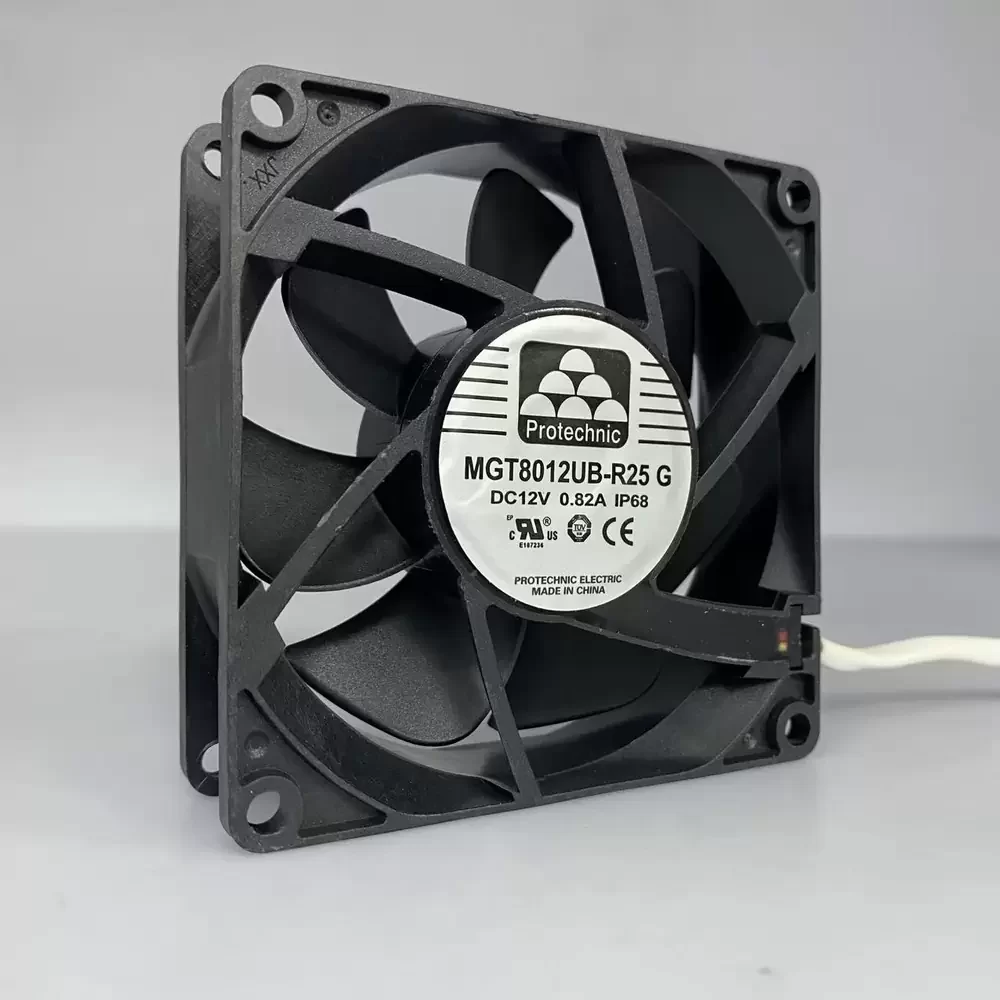 Protechnic MGT8012UB-R25G is an 80 x 80 x 25 mm axial cooling fan operating at 12 VDC with a 0.82 A current draw. It features a dual ball bearing system and a PBT thermoplastic housing and impeller rated for UL 94V-0 flammability. The unit provides an IP68 ingress protection rating, ensuring full submersion capability and dust resistance. Internal electronics are encapsulated for environmental sealing, supporting a 3-wire interface for tachometer output.