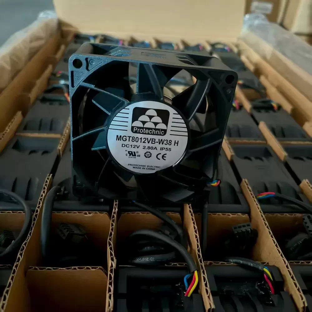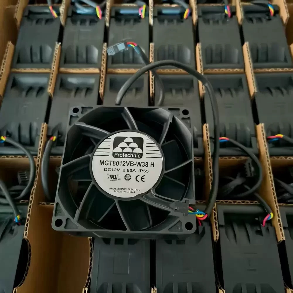 Protechnic MGT8012VB-W38H is a high-performance axial fan measuring 80 x 80 x 38 mm, engineered for high-density thermal management with a 12 VDC nominal voltage and 2.80 A current draw. The unit features a dual ball bearing system and a robust PBT thermoplastic housing and impeller rated to UL 94V-0 flammability standards. It utilizes a 4-wire interface for precise PWM speed control and tachometer feedback, delivering a maximum rotational speed of 10,000 RPM and an airflow capacity of 137.5 CFM. The internal motor includes locked rotor protection and polarity reversal safeguards, while the assembly is rated IP 55 for resistance against dust and water ingress.