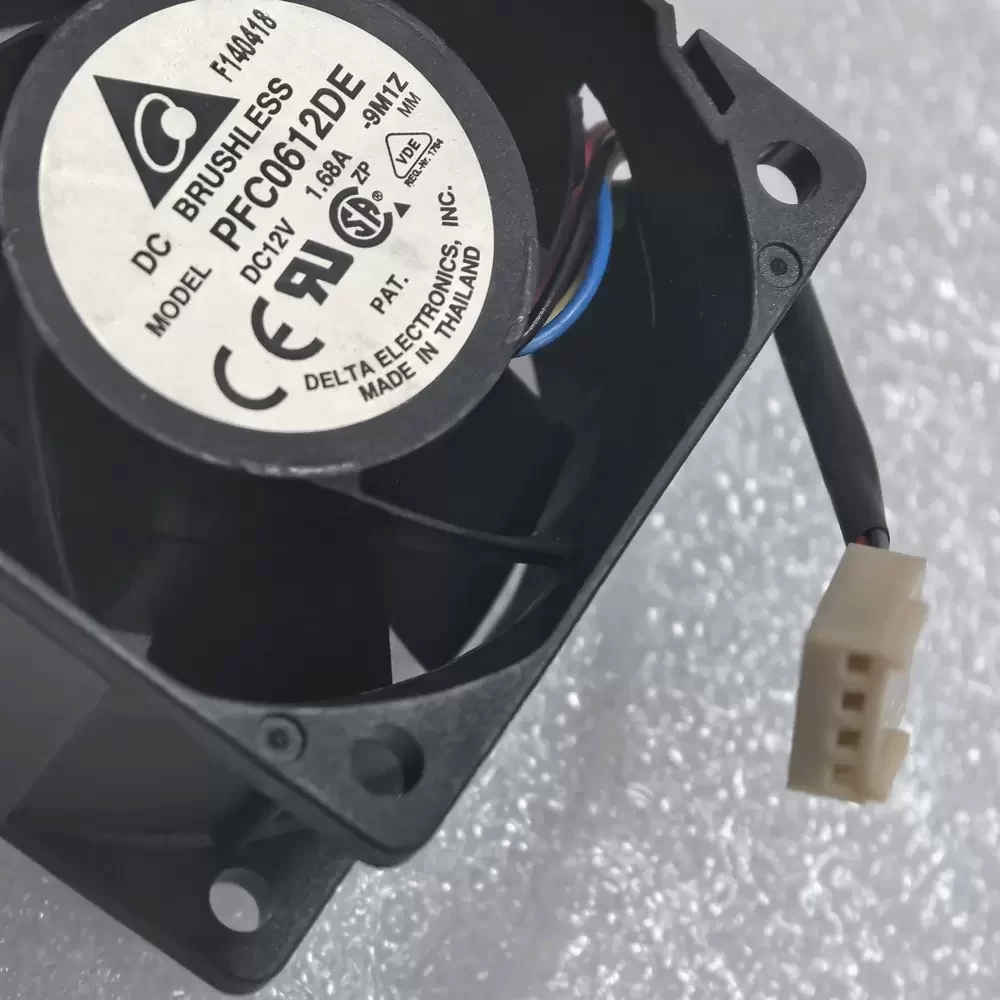 Delta PFC0612DE-9M1Z is a 12VDC 60x60x38mm axial fan optimized for extreme thermal impedance in dense server chassis and power supply units. Engineered with an advanced brushless DC motor and precision bearing architecture, this compact unit delivers exceptional structural rigidity and aerodynamic efficiency under demanding continuous loads. Drawing 1.68A, it generates massive static pressure to overcome restrictive airflow paths in 1U and 2U rackmount systems. The integrated 4-wire PWM interface allows for dynamic speed regulation, ensuring optimal thermal management while minimizing acoustic output during idle states. This server cooling fan serves as a robust replacement fan for mission-critical industrial hardware requiring uncompromising airflow delivery.