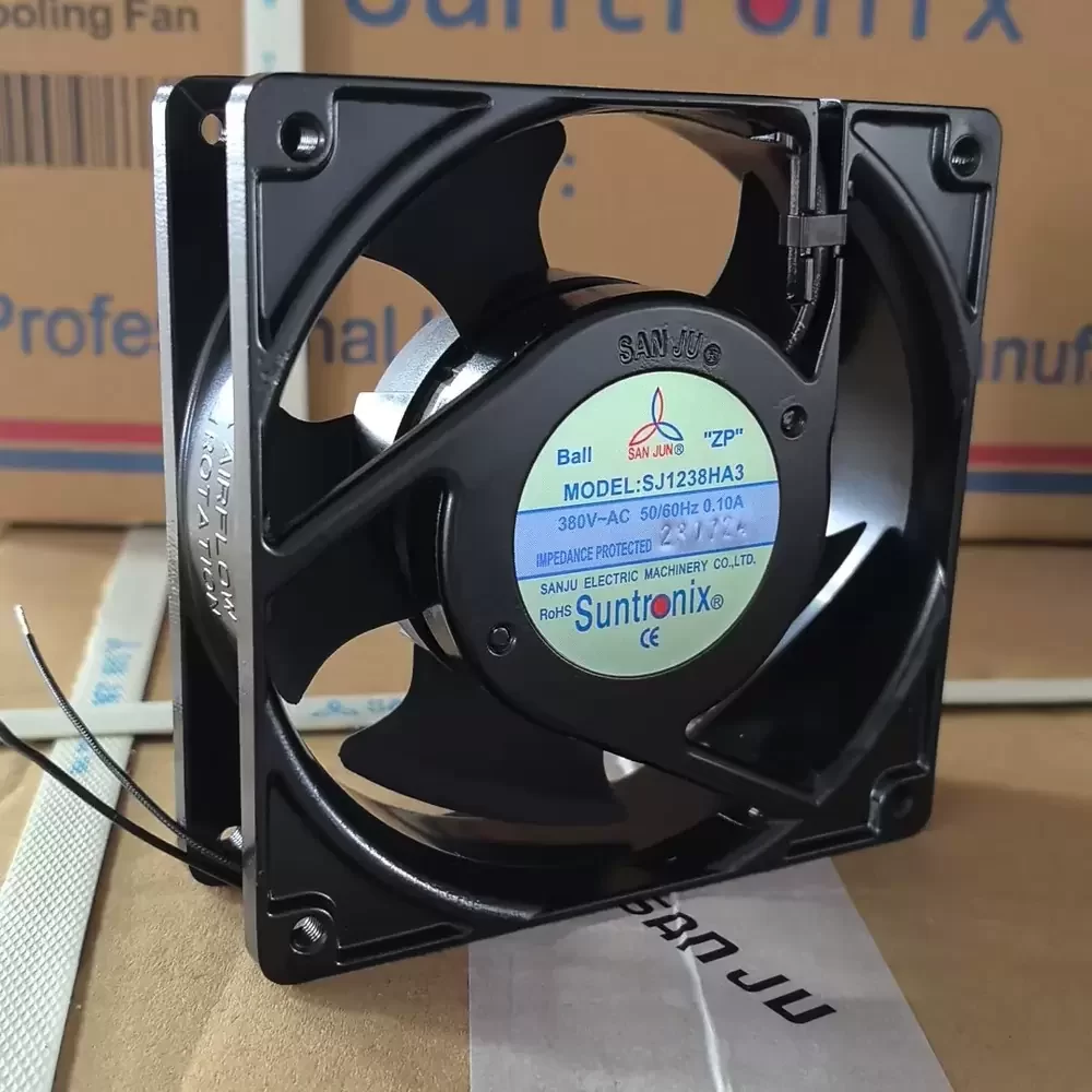 The San Jun SJ1238HA3 is a robust AC Axial Fan designed for high-demand industrial cooling applications requiring consistent thermal management. Engineered with a precision Dual Ball Bearing system, this unit ensures reduced friction and extended operational longevity under continuous loads. The 120mm chassis features an aluminum alloy construction providing superior structural rigidity and heat dissipation properties. Optimized for 380VAC operation, the aerodynamic impeller design minimizes turbulence while maximizing static pressure, making it an ideal solution for overcoming high thermal impedance in densely packed electronic enclosures.