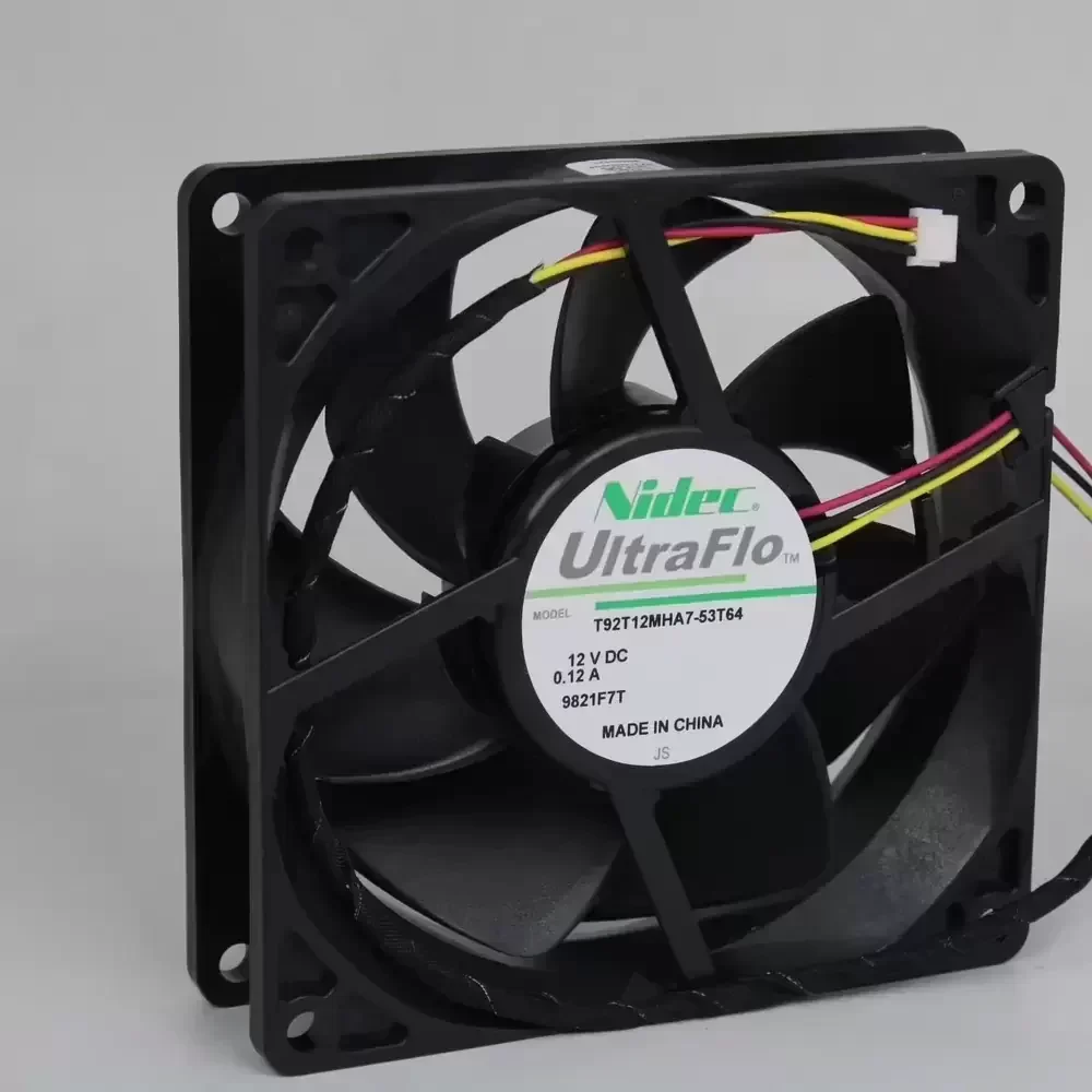 The Nidec T92T12MHA7-53T64 is a precision-engineered DC Axial Fan belonging to the renowned UltraFlo series, specifically optimized for acoustic-sensitive applications such as multimedia projection and audio-visual equipment. Utilizing advanced Nidec Bearing Revolution (NBR) technology, this unit minimizes frictional coefficients and vibrational resonance, ensuring exceptional structural rigidity and prolonged operational stability. The aerodynamic impeller design reduces turbulence-induced noise while maintaining adequate airflow to lower the thermal impedance of critical components. Engineered with a 3-wire interface, it supports tachometer signal output for real-time speed monitoring, making it an ideal solution for systems requiring active thermal management and feedback loops to maintain optimal operating temperatures.