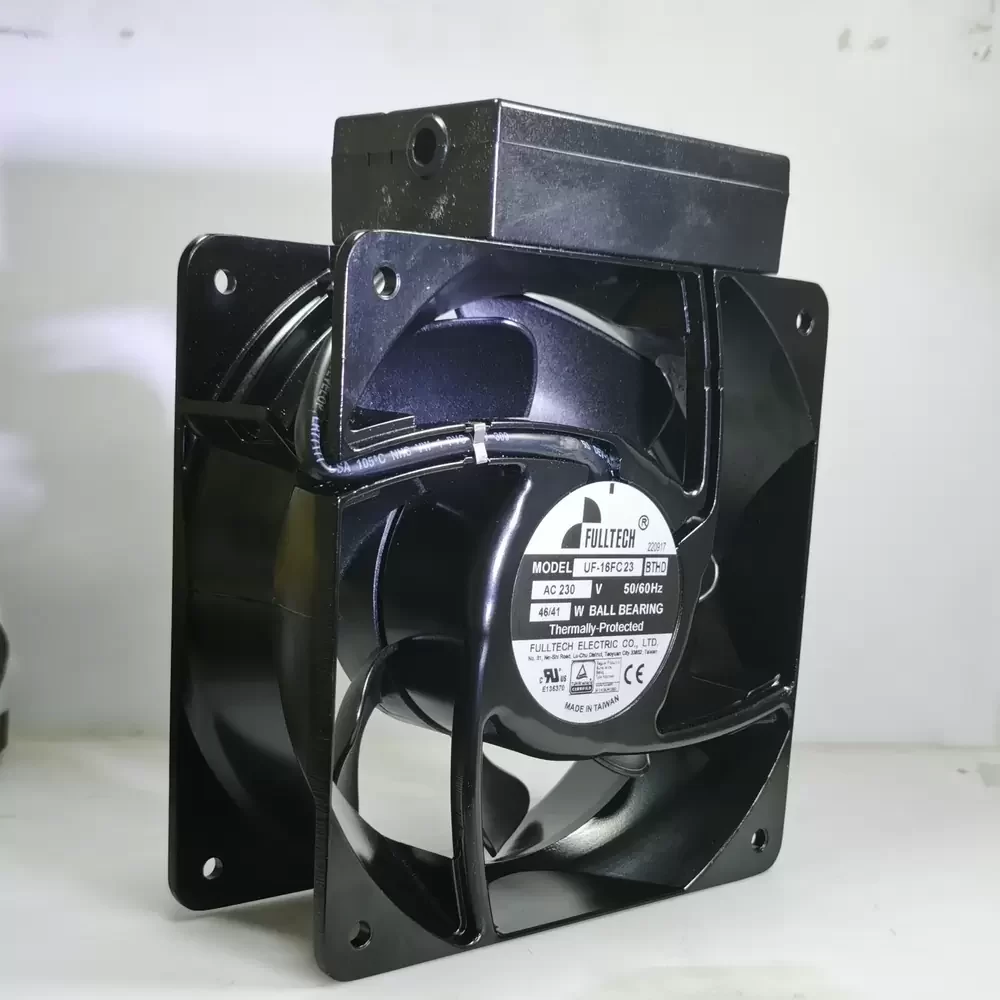 The Fulltech UF-16FC23BTHD is a robust AC Axial Fan engineered for high-demand industrial cooling applications requiring sustained airflow and durability. Utilizing a capacitor-run induction motor paired with a precision dual ball bearing architecture, this unit ensures minimal rotational friction and extended operational longevity under continuous loads. The design features a die-cast aluminum housing which provides superior structural rigidity and aids in thermal dissipation. Its aerodynamic impeller geometry is optimized to reduce turbulence while maximizing static pressure capabilities, effectively lowering thermal impedance in dense electronic enclosures and power systems.