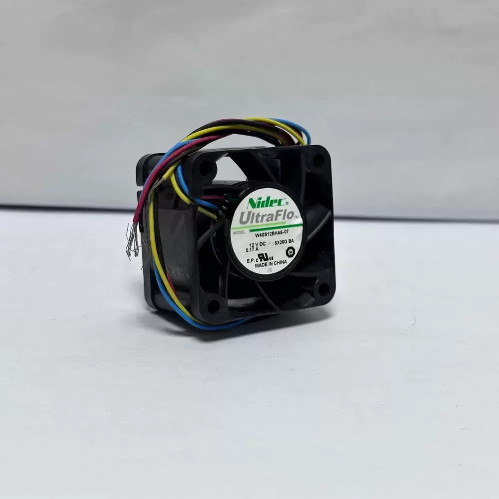 The Nidec W40S12BHA5-07 is a high-performance DC brushless axial fan from the UltraFlo series, engineered for high-density thermal management. This 4028-size unit utilizes a dual ball bearing system to ensure a long service life of up to 70,000 hours at 40°C. Operating at a nominal 12VDC with a low current draw of 0.17A, it delivers a balanced 15.0 CFM airflow and 0.58 inH2O static pressure. The fan features a robust PBT plastic housing and impeller (UL94V-0 rated) designed to maintain structural integrity in demanding industrial environments while providing efficient cooling for space-constrained enclosures.