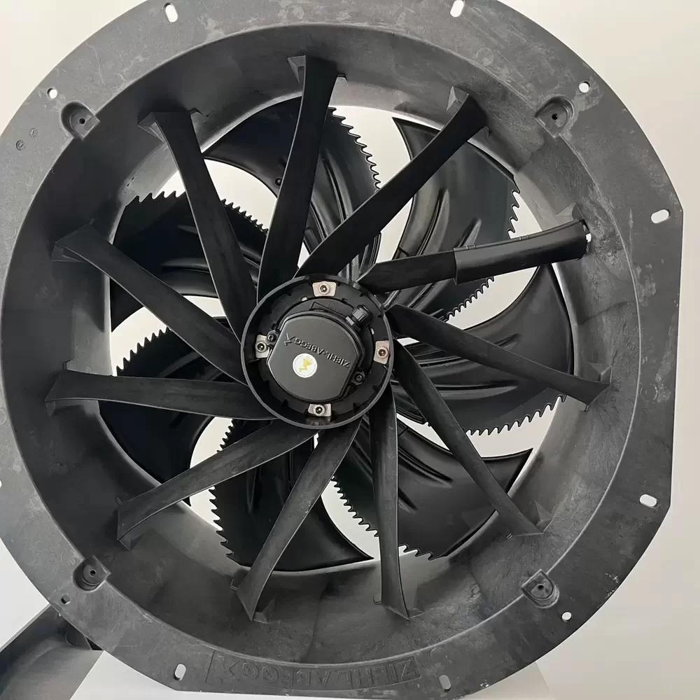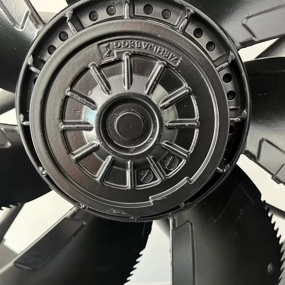 ZIEHL-ABEGG ZN071-SDL.6K.V7P1 710 mm 400 V 980 W axial fan is a high-performance ventilation unit utilizing a ZAplus nozzle system constructed from high-strength composite materials with integrated guide vanes and a short diffuser to optimize airflow and acoustics. The impeller consists of six sickle-shaped blades designed with bionic principles to minimize noise emissions while maintaining high static pressure. The unit is powered by an AC internal rotor motor, dynamically balanced in two planes for vibration-free operation, and carries an IP 54 protection rating for environmental resistance. The structural design includes a corrosion-resistant nozzle and a motor suspension system optimized for high running uniformity and extended service life.